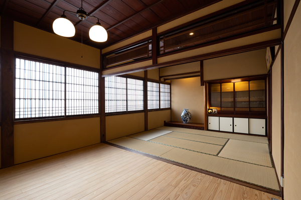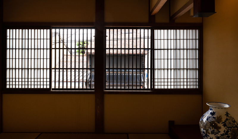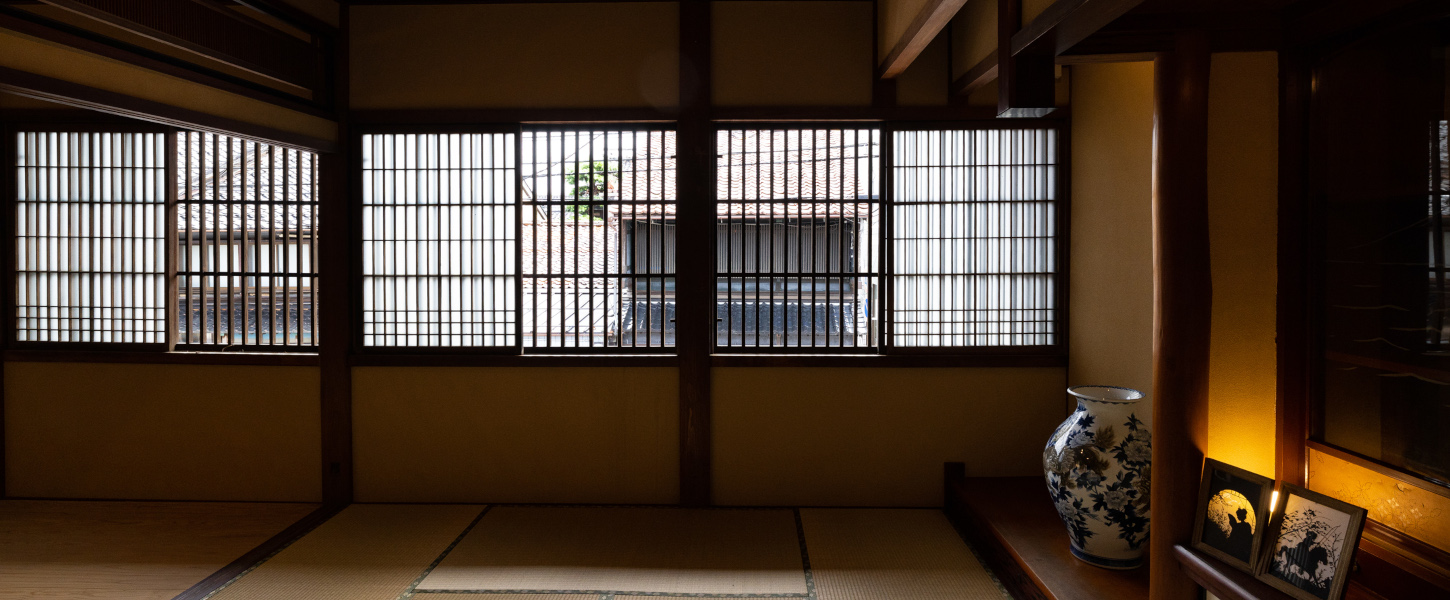 2階の大通りに面した山側のお部屋が「由縁の間」です。 美しい格子戸からは龍助町の街並みを見ることができます。 棚の美しい細工ガラスに当時の職人の技術の高さがうかがえます。