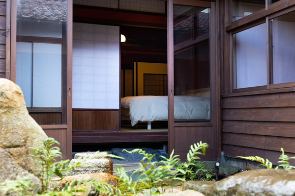 中庭の苔は日用町の苔の里のもの。 雨の日は露に濡れ、晴れの日は青々とする姿に心動かされることでしょう。 縁側にかけて本を読んだり、会話を楽しんだりと自由な時間をお過ごしください。