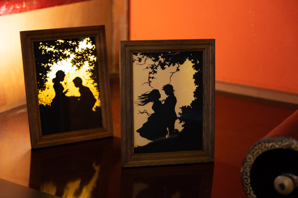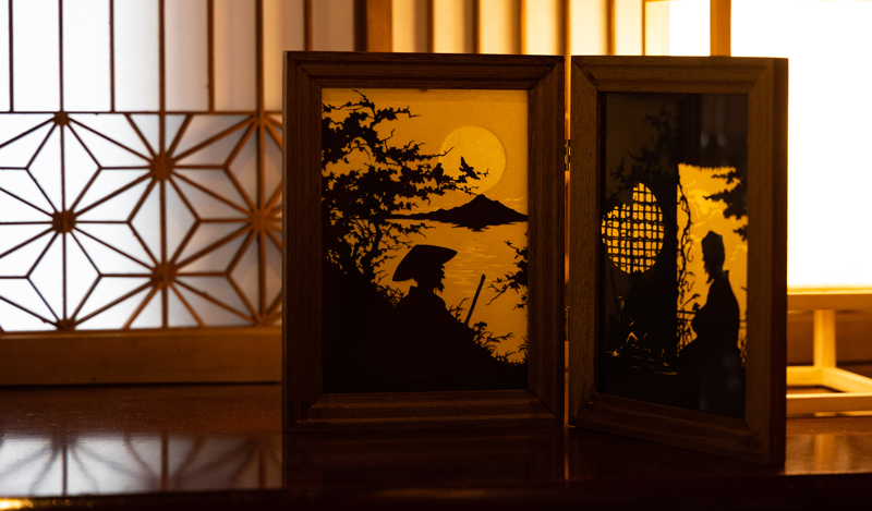 加賀市在住・フランス人切り絵アーティスト・アレックスさんの作品は1階の庭の間と2階の由縁の間に飾られています。 そのほか九谷焼、オーナーが集めた絵画やアンティークの家具などが館内のところどころに飾られております。