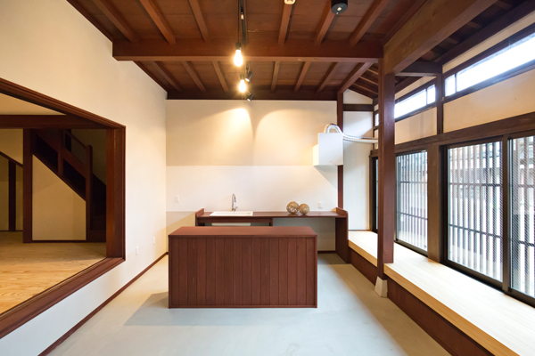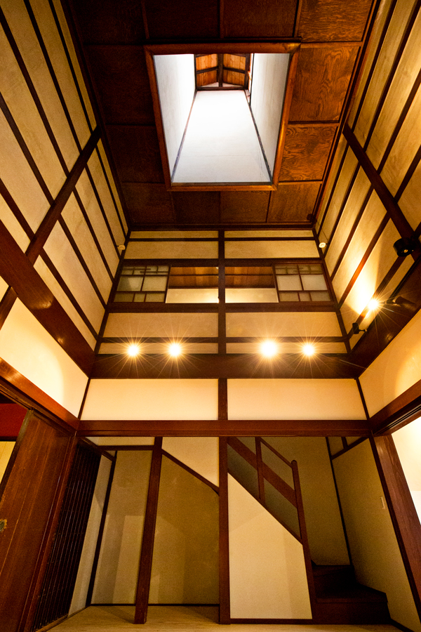 町家の特徴でもある吹き抜けの空間。 通常の町家のこういった空間では天井に大きな梁がかかっていることが一般的ですが、『龍助25』には梁がありません。 そのため、天井高くまで開放的な空間がひろがり、天窓から明るい日がそそぎます。